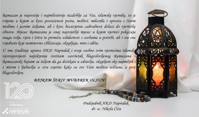 U ime Središnje uprave HKD Napredak i svoje osobno svim vjernicima islamske vjeroispovijesti najiskrenije čestitam završetak blagoslovljenog Ramazana i Ramazanski bajram sa željom da ga dočekate u zdravlju, okupljeni oko najmilijih i s mirom i ljubavlju u srcu osjetite kako su sve Vaše molitve uslišene, a post blagoslovljen.”