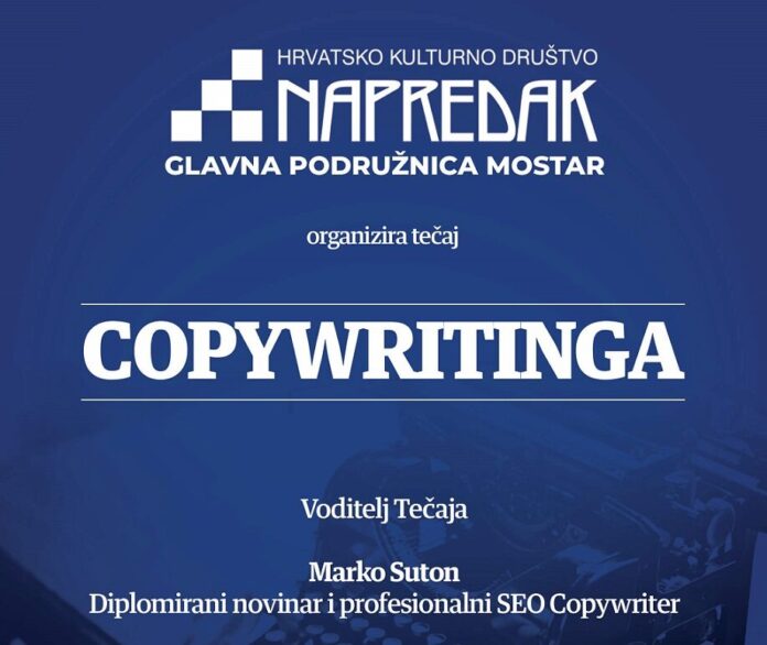 HKD Napredak Glavna podružnica Mostar u suradnji s Narodnom knjižnicom HNŽ-a u Hrvatskom domu hercega Stjepana Kosače zbog velikog interesa organizira i treći ciklus Tečaja pisanja tekstova iz područja copywritinga, a koji će svoj prvi susret imati u ponedjeljak, 4. listopada 2021. godine s početkom u 19 sati u prostorijama čitaonice. Kroz osam susreta polaznici tečaja će teorijski i praktično savladati pisanje sadržaja za tekstove iz područja copywritinga: razne objave za društvene mreže, PR tekstove, službene emailove i newslettere kao i blog tekstove koji će biti svojevrsna kruna cijelog tečaja koji je pomogao mnogima da uđu u svijet copywritinga.