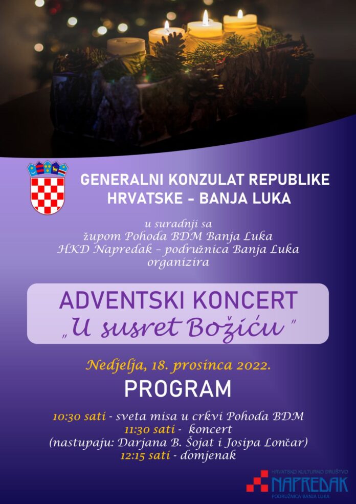 U susret najradosnijem blagdanu i kao kruna ovogodišnjeg predanog rada i zalaganja Generalni konzulat Republike Hrvatske u Banjaluci, u suradnji sa Župom Pohoda BDM te banjalučkom podružnicom HKD Napredak organizira adventski koncert “U susret Božiću”, koji će biti upriličen u nedjelju, 18. prosinca 2022.