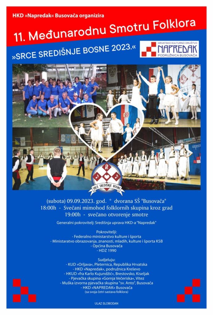 Hrvatsko kulturno društvo “Napredak” podružnica Busovača u subotu, 9. rujna, organizira XI. međunarodnu smotru folklora “Srce Središnje Bosne”.