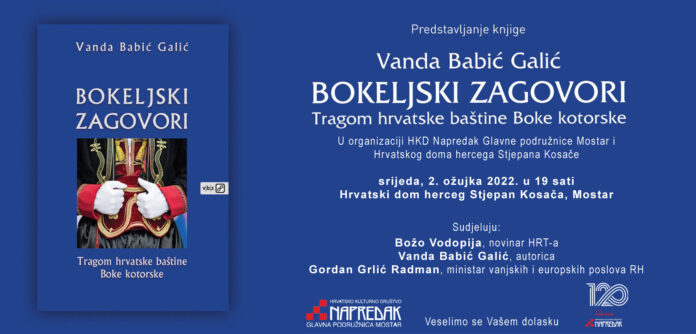 U organizaciji HKD Napredak Glavne podružnice Mostar i Hrvatskog doma hercega Stjepana Kosače, u srijedu, 2. ožujka 2022. s početkom u 19 sati u Galeriji kraljice Katarine Kosača u Hrvatskom domu hercega Stjepana Kosače održat će se predstavljanje knjige Vande Babić Galić, „Bokeljski zagovori“, nedavno objavljene u nakladi VBZ-a.