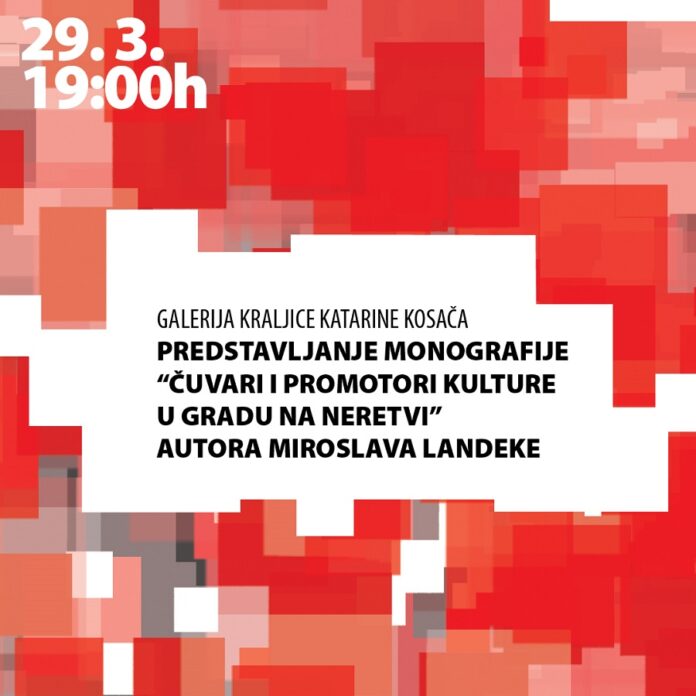 Večeras, u srijedu, 29. ožujka 2023. s početkom u 19 sati u Galeriji kraljice katarine Kosača u Hrvatskom domu hercega Stjepana Kosače bit će upriličeno predstavljanje monografije „Čuvari i promotori kulture u Gradu na Neretvi“ autora Miroslava Landeke, predsjednika HKD Napredak Glavna podružnica Mostar i dopredsjednika Središnje uprave HKD Napredak u Sarajevu.